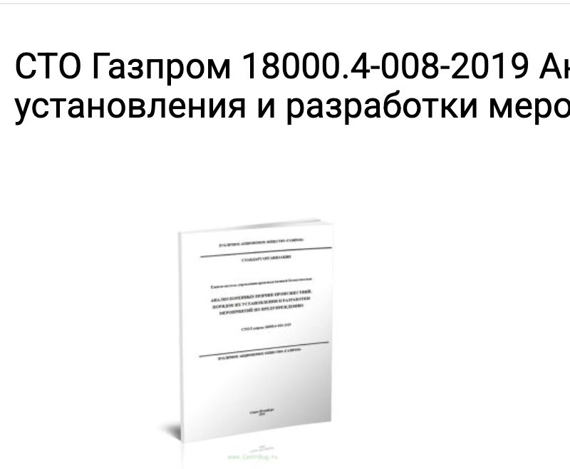 - Например СТО Газпром 18000.4-008-2019 Анализ коренных причин происшествий. Порядок их установления и разработки мероприятий по предупреждению 2024 год. Получите аж 249 грамм RCA.